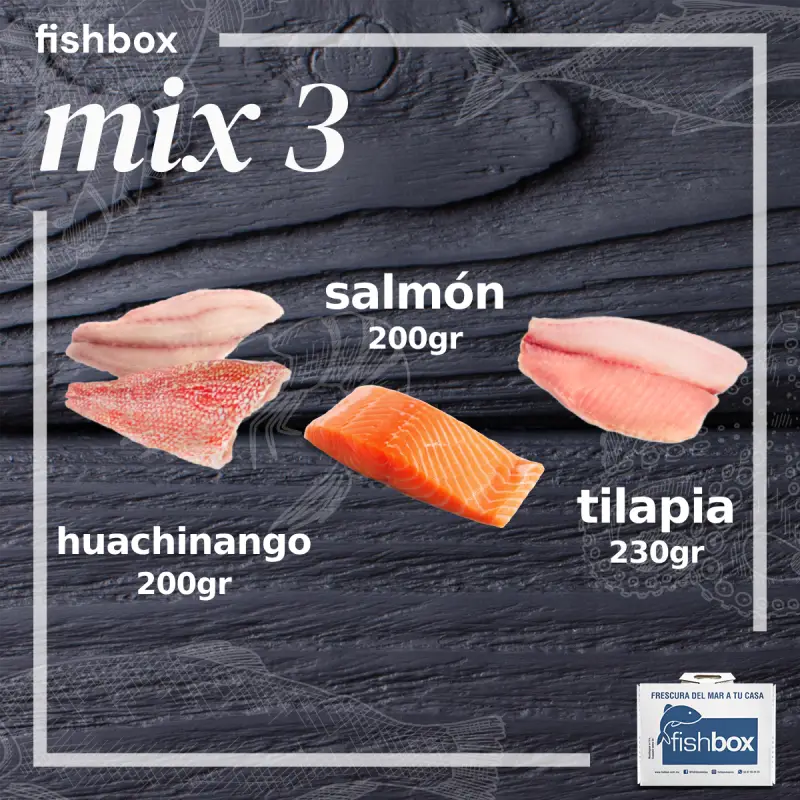 3kg: 5 piezas de Huachinango + 5 piezas de salmón + 4 piezas de tilapia