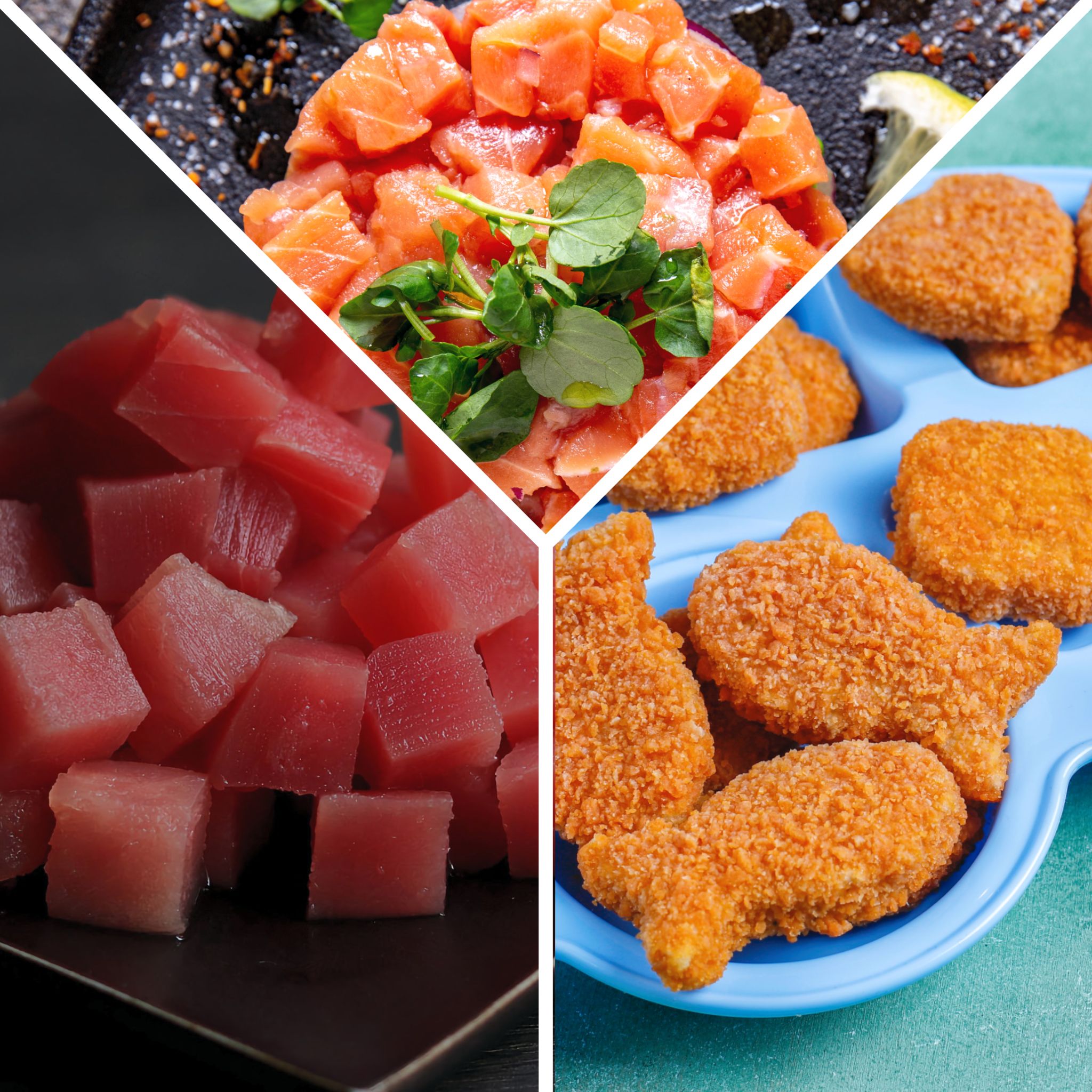 1.8kg: 2 paquetes de cubos de salmon + 2 paquetes de cubos de atún + 2 paquetes de nuggets de pescado.